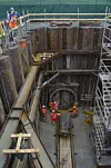- Vi benytter oss av åpen front med overtrykk i dette prosjektet, og vi sluserinn massene porsjonsvis etterhvert som borehodet skyves framover. Dette for å unngå at jorda flommer ukontrollert inn i fronten, forklarer Øksne. Fremst i hodet av «ormen» sitter operatørene og styrer hodet etter gitt retning. I dette prosjektet er det flere retningsendringer og for å lykkes med dette har man ulike rør, som mates inn etter et godt planlagt opplegg.