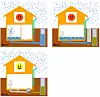 Ø.t.v: tilbakeslagsventil plassert i laveste sluk. Ø.t.h: Tilbakeslagsventil plassert nedstrøms taknedløp. Nederst: Tilbakeslagsventil korrekt plassert.