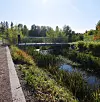 Her er Hovinbekken som renner gjennom Bjerkedalen park. Den ble gjenåpnet i 2013 etter å ha ligget i rør under bakken i 50 år. Foto: Dronninga Landskap AS.